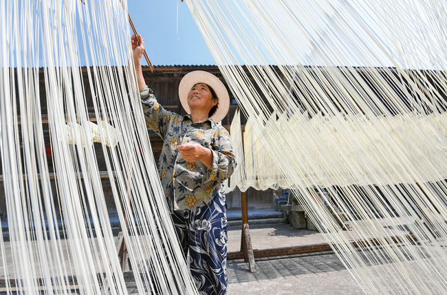 9月5日,在金華市浦江縣杭坪鎮裕民村、東嶺村等村莊,村民們利用晴好天氣晾曬手工面。 9月是當地手工面生產加工旺季,村民們把做好的面條切割、包裝后,通過超市、土特產店和網絡平臺等線上線下渠道進行銷售,成為增收的一項重要來源?!?/a>