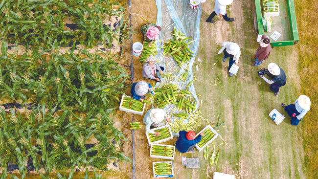 6月10日,金華蘭溪市游埠鎮一家庭農場玉米種植基地,工作人員正忙著將新鮮采收的甜糯玉米新品種裝箱銷售。(胡肖飛)?!?/a>