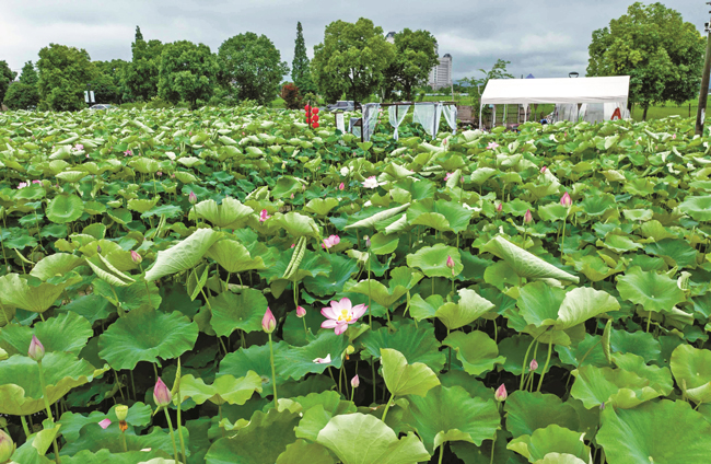 6月10日,在寧波市海曙區集士港鎮新后屠橋村,蒙蒙細雨中氤氳著荷香。據介紹,村內50畝荷塘種植的荷花主要品種為太空蓮,因曾搭乘航天器完成太空育種得名,花朵直徑可達30厘米?!?/a>