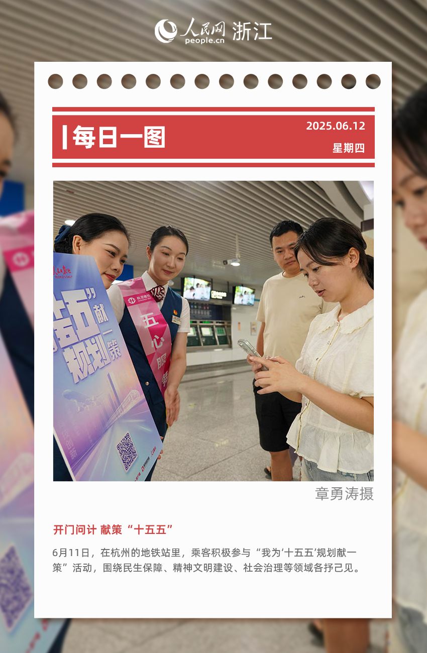 人民網杭州6月11日電 (孫鵬)今天,在杭州的地鐵站里,乘客積極參與“我為‘十五五’規劃獻一策”活動,圍繞民生保障、精神文明建設、社會治理等領域,各抒己見。 “十五五”規劃編制工作網絡征求意見活動自5月20日起開展,廣大人民群眾和社會各界可以通過人民日報客戶端、人民網網頁端、“人民網+”客戶端等渠道積極參與,分享智慧,貢獻真知灼見,為高質量編制“十五五”規劃建言獻策?!?/a>