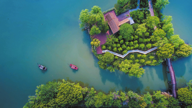 6月6日,湖州市長興縣太湖圖影濕地公園,游客泛舟在宛如一幅美麗生態畫卷的湖中。近年來,該縣大力推進太湖流域水環境治理,堅持長效水體生態治理,生態環境質量穩步提升?!?/a>