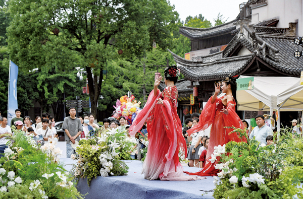 6月1日,金華市區婺州古城保寧門廣場熱鬧非凡,游客觀賞舞臺上“古典古風”舞蹈表演。端午假期,婺州古城里人頭攢動,來自各地的游客逛古城,觀看“官兵巡街”、道情、古典舞蹈等表演,在餅街品嘗八婺特色小吃,盡情享受假期生活?!?/a>