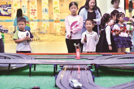 6月1日,在嘉興秀洲區科技創新研學基地的“六一”科技童玩節現場,孩子們正在沉浸式體驗各類科技項目。電磁軌道遙控車讓小朋友化身“小小賽車手”?!?/a>