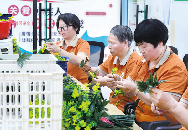 5月15日,在金華金東區嶺下鎮“殘疾人之家”內,各村殘疾人聚集在一起做手工活,組裝塑料花。據悉,嶺下鎮殘聯工作人員通過聯系義烏小商品生產企業,對接了組裝塑料花、香水瓶等一些簡單易學的來料加工手工活,幫助殘疾人增加收入,自食其力?!?/a>
