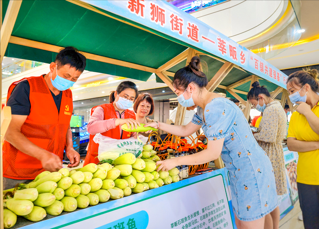 7月3日下午,在金華婺城區新獅街道萬固廣場,新獅街道和莘畈鄉聯合舉辦“惠農直通車”農特產品展銷活動引人矚目,黨員志愿者為山區農特產品賣力吆喝?!盎蒉r直通車”進商超活動是婺城區深化“百鎮共建強基行動”的一個縮影,也是黨建統領先富帶動后富機制的一項實際舉措?!?/a>