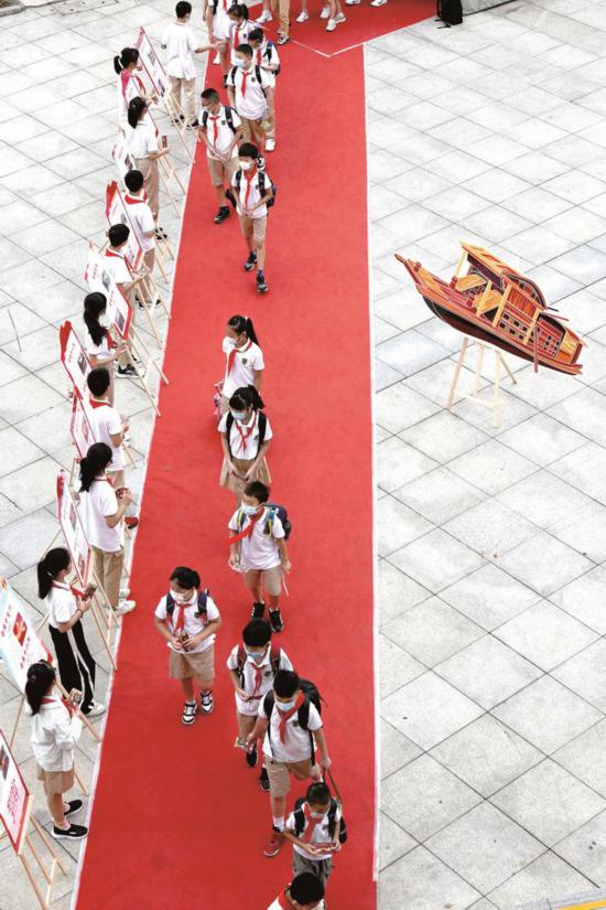 9月1日是嘉興市中小學2022學年開學第一天。當天上午,在秀洲實驗小學,老師們在校門口精心布置了南湖紅船和中共一大到中共十九大的宣傳展板,學生每人手握一張印有南湖紅船的船票,結伴參觀黨史展板,學習黨史知識?!?/a>
