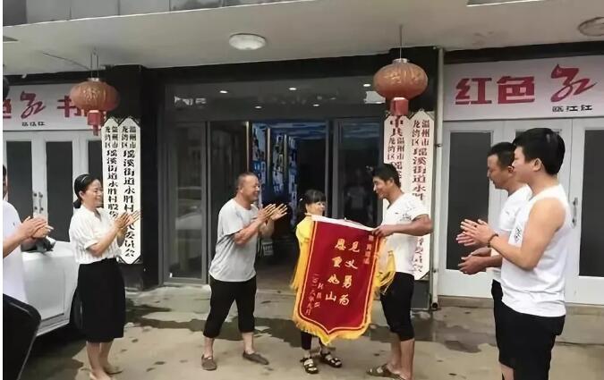 第二天一早,像往常一樣去店里吃早餐的黃某二人,被尋找恩人的女孩父親找到,一家子為了感謝黃某二人見義勇為的舉動,將印有“見義勇為恩重如山”的錦旗送到了他手中。