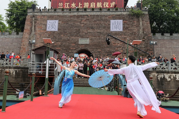 領略過秀水之美,游船?刻m溪海事碼頭。游客沿著西門城樓、解放路、探花巷、步行街、告天臺漫步,漢服表演,李漁、黃大仙模仿秀,戲曲互動等戲劇元素隨處可見,精彩的戲劇沉浸式體驗,讓游客領略千年古城的深厚文化底蘊。