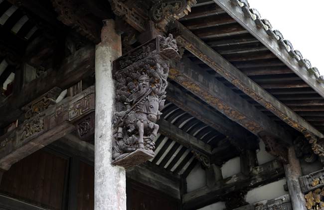 兩座連進四斢的居宅,前后各有一座臺門,均用石條拼接而成,刻有花紋、飛禽、走獸,極其美觀。左側門額上刻有“耕讀傳家”4個字,筆力雄渾厚重,昭示子孫后代繼承先祖遺風。
