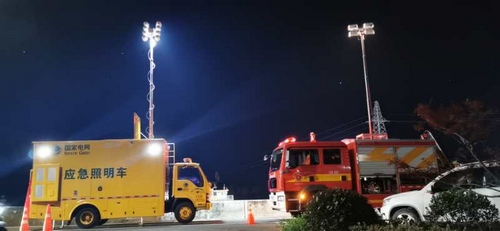 8日0時15分,盧錚已經召集好同事隊友共8人,組建了一支應急基干隊伍臨時小分隊,配備攜帶了應急照明移動大型升高照明1臺、小型2臺、手提式5臺以及相應的發電機組,乘坐渡輪登島。夜間籠罩,水霧彌漫,站在船上感覺渡輪四周富春江水都顯得特別的黑暗,唯有一束光芒刺破黑暗,照向奔赴的前方。
