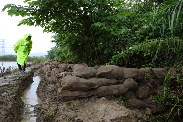 埭溪鎮小羊山村黨總支副書記許玉章巡堤。