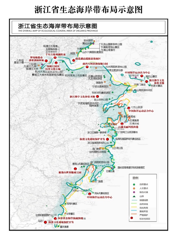 同時,浙江省生態海岸帶將建設十大標志性項目!督ㄔO方案》初步提出打造南北湖高端旅游休閑區、千年古塘觀潮勝跡、夢錢塘都市創業創新回廊、前灣萬頃濱海濕地公園、石浦美麗風情漁港、抗倭文化遺址保護開發、中國海洋運動活力中心、漁寮黃金海岸休閑沙灘、浙江佛學文化體驗圣地、錢塘江圍墾歷史文化長廊等十大標志性項目,成為浙江生態海岸帶最靚麗的“珍珠”。