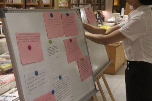 在讀書分享會的最后環節,來自浙江省農行分行的中青年黨員們紛紛將對《習近平談治國理政》第三卷的心得撰寫在便簽上互相學習交流。(毛和鑫)