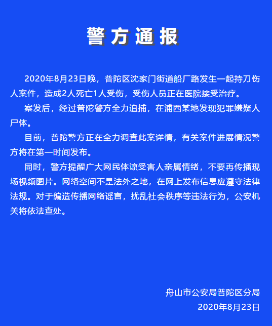 人民網杭州8月24日電 (郭揚)據“浙江普陀公安”公眾號消息,2020年8月23日晚,浙江舟山普陀區沈家門街道船廠路發生一起持刀傷人案件,造成2人死亡1人受傷,受傷人員正在醫院接受治療。