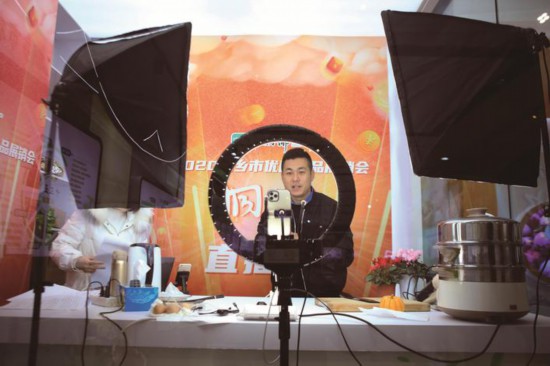 昨天(1月9日),嘉興桐鄉市舉行“十三五”農業農村成果展暨2020桐鄉市優質農產品展銷會,網上農博桐鄉館同時開館,工作人員進行農產品銷售直播,讓市民不出門就能買到桐鄉的名優特產!熬W上農博”是展銷桐鄉優質放心農產品、特色小吃的線上平臺。(成 杰、滕江南)