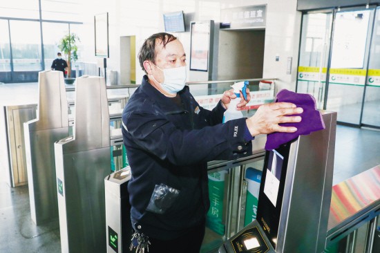 1月14日,紹興北站工作人員正在對站內設施進行消毒。據悉,為確保即將到來的春運安全有序,紹興北站進一步加強疫情防控,對每一名進出站的旅客進行體溫檢測和健康碼查驗,做到“一個不漏”。另外,加大了公共區域預防性消毒的力度和頻次,每天4次消毒,重點區域更是每2小時消毒一次,做到“一處不漏”。(章斌)