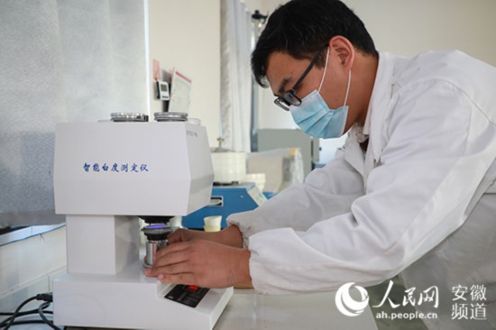 蒙城恒瑞面粉有限公司工作人員正在檢測面粉品質。人民網張俊 攝