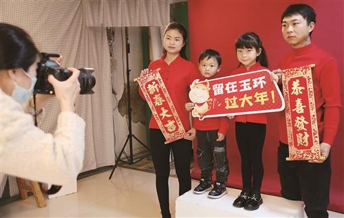 1月28日,臺州玉環市紅門攝影社,河南籍李欣一家、王瓊一家正在拍攝全家福,定格第二故鄉的幸福瞬間。據了解,愛心全家;顒,是玉環團市委聯合玉環流動人口服務中心、中國人民銀行玉環支行、臺州銀行玉環支行推出的愛心速遞第二個項目,免費為留在玉環過年的100戶新玉環人家庭拍照。