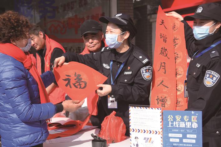 2月7日,嘉興平湖市公安局鐘埭派出所民警開展了“寫春聯 送祝!被顒;顒友垥嫄酆弥驹刚呓o村民寫春聯,并將“!弊至艚o當地過年的新居民。民警送“!钡耐瑫r,還送去春節安全防范知識和窗口便民服務知識,讓大家過一個平安開心年。