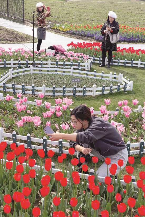 昨天(3月10日)中午,在嘉興經開區姚家蕩公園西側花地,大片的郁金香競相綻放,市民們拍照打卡,各得其樂。