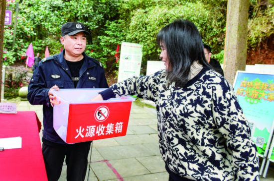 3月20日,在金華開發區湯溪鎮九峰山腳,工作人員手捧火源收集箱,讓進山游客拿出打火機等物品,嚴格杜絕攜帶任何火種上山。清明前夕,遇到進山祭祀的村民,工作人員還會免費送上絹花,倡導文明祭祀。據了解,九峰山除在山腳設有防火檢查站,山頂還設有固定值守,同時有專人負責巡山,形成立體防控。(李建林)