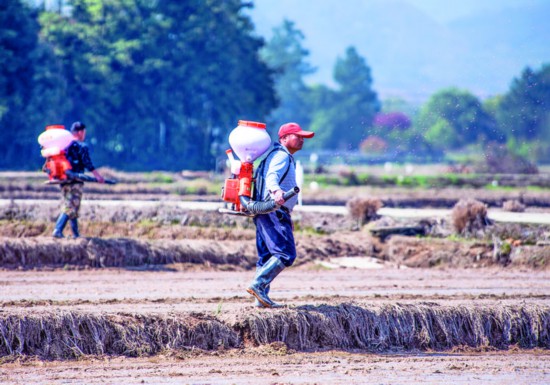3月23日,在金華婺城區蔣堂鎮柿樹壟村,農戶背著直播機在田間穿梭,抓住農時播種早稻。 種糧大戶盛桂有介紹,他今年要播種700畝早稻,兩個人操作兩臺機器一天可以播種120畝左右。采用直播機播種的早稻,具有省工省時、效率高、產量穩定、抗倒伏等優點。(時寬兵)