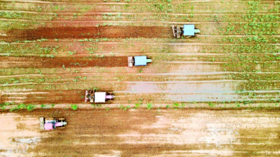 4月5日,在金華金義新區塘雅鎮萬畝全域土地綜合整治項目現場,數臺旋耕機在翻耕作業,為即將開始的早稻播種做準備。今年,金義新區原先種植苗木的低丘緩坡進行兩年土地整治,目前已形成1.5萬畝高標準新農田。去年冬天種上油菜和紫云英,今春作為綠肥還田后,即將全部種上水稻,預計可增收1500萬公斤稻谷。(胡肖飛)
