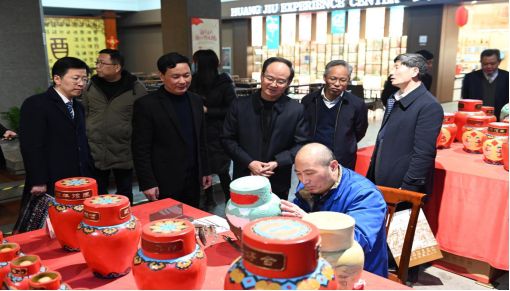 徐明光(中)帶領紹興市黃酒協會成員考察紹興黃酒花雕非遺傳承技藝。沈鴻泉攝