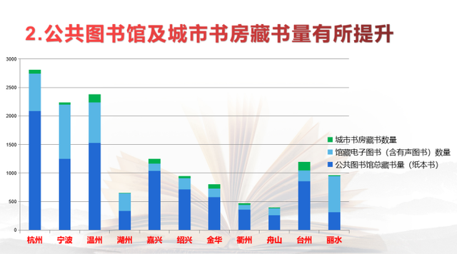 在全民閱讀服務設施狀況方面,因規模、數量不斷壯大提升,居民滿意度較高,達到88.5%。據統計,浙江各地市建有公共圖書館、城市書房、實體書店書吧、藏書樓和書院等閱讀服務設施超12000個;各市公共圖書館(含分館)紙本書藏書量9315萬冊,電子圖書(含有聲書)4120萬冊(種),城市書房藏書量691萬冊。