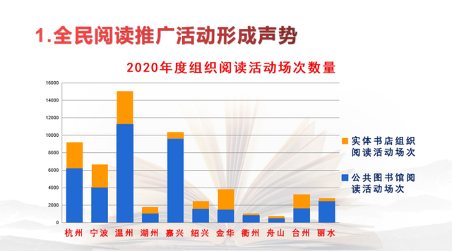 在全民閱讀活動開展方面,各地“全民閱讀節”、“讀書日”、書展等推廣活動形成聲勢,居民參與滿意度高達94.9%。各地市公共圖書館共開展閱讀推廣活動約4.4萬場,其中,溫州超出1萬場,嘉興接近1萬場;各地實體書店、書吧共組織閱讀推廣活動1.6萬場。