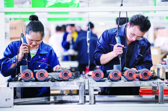 4月27日,金華金磐開發區威邦集團有限公司車間,工人在忙著裝配過濾器產品。據了解,威邦集團通過數字化改造,目前已成為全球最大的戶外移動泳池生產企業,預計今年銷售額將達到40億元。(胡肖飛)