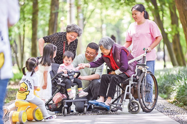 5月3日,金華蘭溪市中洲公園茂密的樹林中,在外地工作的章俊一家祖孫四代安逸休閑,享受天倫之樂!拔逡弧奔倨,金華市民紛紛走進大自然,呼吸新鮮空氣,樂享假期。(胡肖飛)