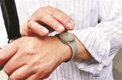 視力障礙的范先生帶上了智能的導盲手環。走到過街的人行道邊上,他便聽到滴滴聲,之后還有清晰的提醒聲,“香積寺路綠燈,請通行!”