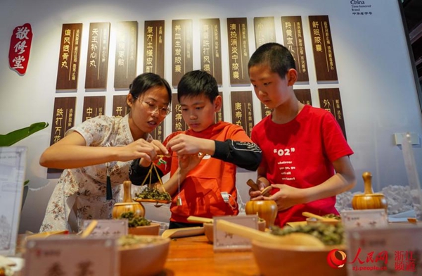 兩位小學生在慈城古縣城敬修堂傳統中藥文化體驗館制作香囊。人民網 章勇濤攝