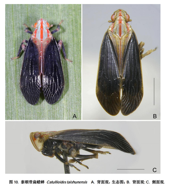 近日,我國學者在國際動物分類學期刊《ZooKeys》上發表論文,記述了我國扁蠟蟬科昆蟲一新種泰順帶扁蠟蟬Catullioides taishunensis。該新種的模式標本是在生態環境部生物多樣性重大工程項目子課題資助下,在浙江泰順昆蟲多樣性摸底調查中采集到的。為了展示泰順多年來在生物多樣性保護方面做出的工作和成績,特地以新種的發現地“泰順”命名該新種。該論文同時對帶扁蠟蟬屬進行了重新修訂和描記。