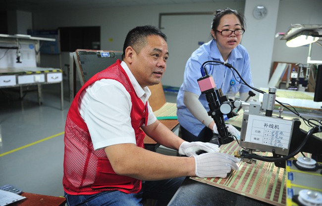 衢州市財貿工會主席萬新喬的工作是修補線路缺陷,這是一個精細的技術活——每塊電路板只有指甲蓋大小,修補線路缺陷是要在細如發絲的線路上進行精準補焊。