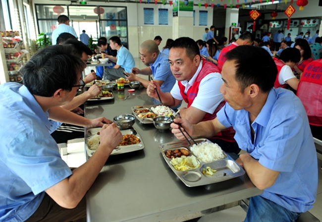 工會干部飯間和工人們嘮家常,了解工人們的需求和問題。姚磊攝
