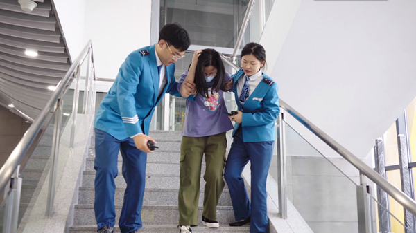 當天下午15時,隨著總指揮一聲令下,演練正式開始。演練現場模擬列車在鹽官站出站百米標K280處時,因乘客攜帶折疊電動自行車鋰電池冒煙、起火、爆燃,火勢不可控,列車迫停區間,司機及車站員工疏散現場乘客,火災撲救無效后,迅速撥打119、110、120請求支援,并請求公交接駁。