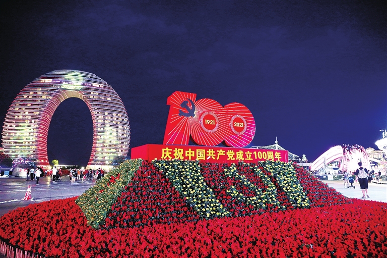 連日來,湖州各區縣地標紛紛以主題燈光秀慶祝建黨百年。愛山廣場及周邊高層建筑、長興縣太湖龍之夢太湖古鎮、德清國際會議中心、安吉縣安商大廈、南潯區未來廣場大廈等都披上了璀璨的燈光,流光溢彩。圖為南太湖新區月亮酒店廣場夜景。(項飛、王迅、朱孟浩)