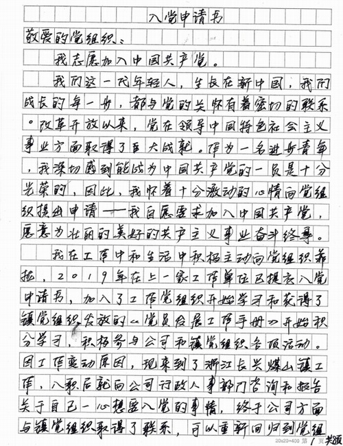 周志強團隊成員佘燕提交入黨申請書。受訪者供圖