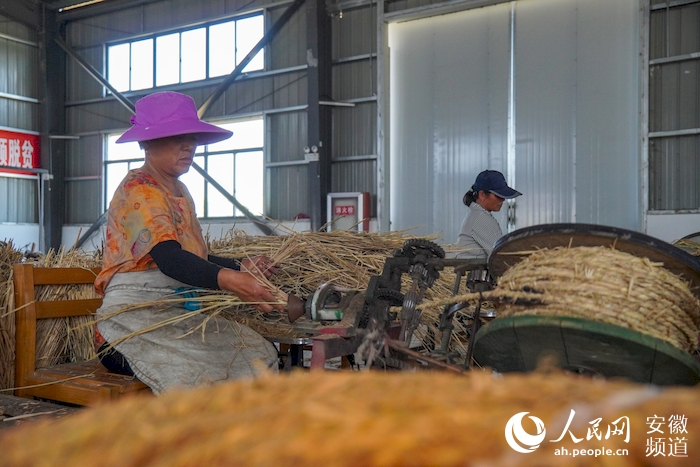 臨近中午,白蓮坡鎮新莊村草繩編織車間內依舊是忙得熱火朝天,十幾架草編機飛快運轉著,村民將回收來的秸稈塞進機器內,一段草繩很快編好。匯農草編專業合作社負責人唐建軍告訴人民網安徽頻道,這座車間建成于2019年12月,面積780平方米,內部共有草繩加工機器36臺,每臺機器一年能給村民增收1到2萬元。