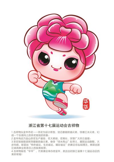 吉祥物以金華市花——茶花為設計原型,結合婺劇元素、錢塘江水元素,展現一個樂觀向上的茶花娃娃的形象。娃娃臉部融入婺劇戲曲元素,身穿“綠水青山”肚兜兒,腳踩運動鞋,大步向前,彰顯出“生態省運、人文省運、智慧省運”的賽會宗旨和理念。
