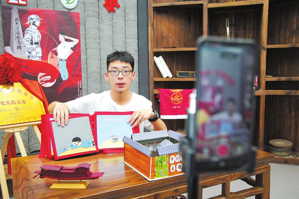 湖州市南潯區和孚鎮文化綜合站內,浙江理工大學學生日前正通過直播介紹紅色文創產品。近年來,和孚鎮重視挖掘紅色歷史,將紅色資源和綠色旅游有機結合,用紅色文化助力經濟繁榮,打造鄉村振興新模板。(張斌)
