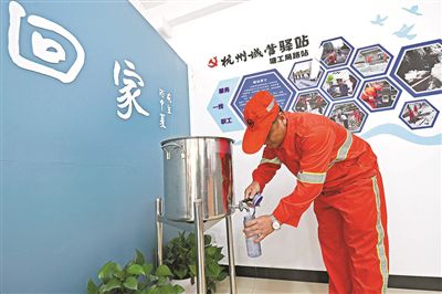 位于岳王路的杭州市職工服務中心“愛心驛家”,不僅是環衛工人的休息點,也是快遞員、公交司機、出租車司機的“加油站”。在這里,他們可以倒上一壺養生茶,吹吹空調,解除戶外作業的暑熱!叭硕嗟臅r候,我們一天要供應三四桶養生茶!笔新毠し⻊罩行墓ぷ魅藛T樂呵呵地表示,免費供應茶水的服務已經開展了兩年了,受到戶外工作者的一致好評。