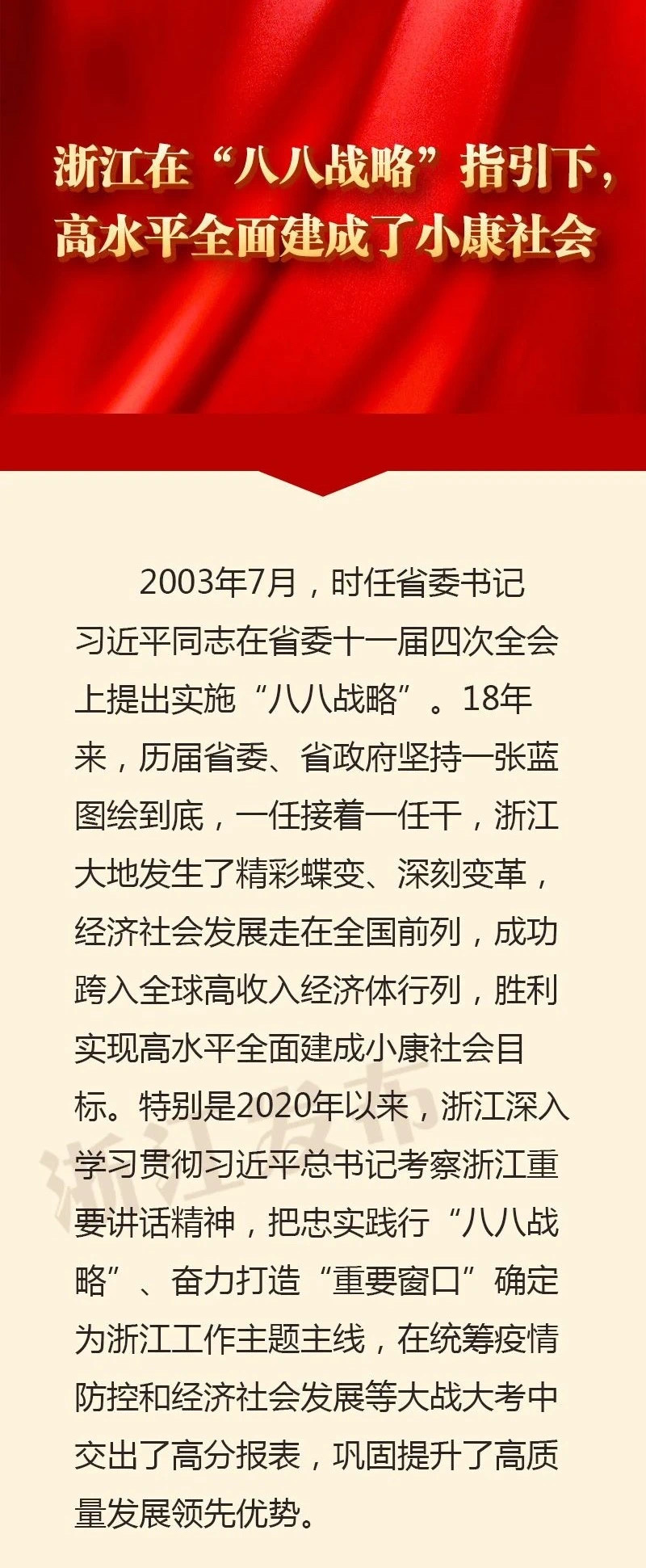“八八戰略”是習近平總書記為浙江量身定做的引領浙江發展的總綱領、推進浙江各項工作的總方略,是習近平新時代中國特色社會主義思想在浙江萌發與實踐的集中體現。在全國上下深入學習貫徹習近平總書記在慶祝中國共產黨成立100周年大會上重要講話精神之際,回首實現第一個百年奮斗目標的歷史進程,浙江發生的歷史性變化、整體性躍升歸根結底得益于“八八戰略”的科學指引;放眼實現第二個百年奮斗目標新的趕考之路,浙江要在忠實踐行“八八戰略”上更顯擔當、再續華章,不斷開辟干在實處、走在前列、勇立潮頭新境界!