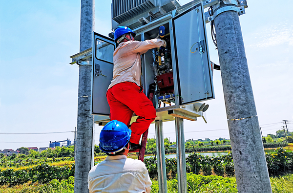 南潯供電分公司菱湖供電所員工在烈日下為菱湖鎮楊家巷村石排圩臺區更換低壓配電柜和低壓進、出線電纜,保障養殖戶用上放心電。陳建華攝