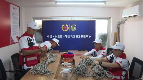 當天,在永嘉縣紅十字飛龍救援隊會議室內,救援隊水上救援組組長葉岳杰正在培訓新隊員如何使用救援繩索!八暇仍K索不能綁在自己身上,要往落水人員頭部拋,盡量保證準確度,拋到后要兩個人配合往回拉,確保自己的安全!比~岳杰說,由于永嘉縣山區小溪流、溝壑較多,水上救援有一定難度,他們更新了設備,培訓大家使用拋投器等救援工具。