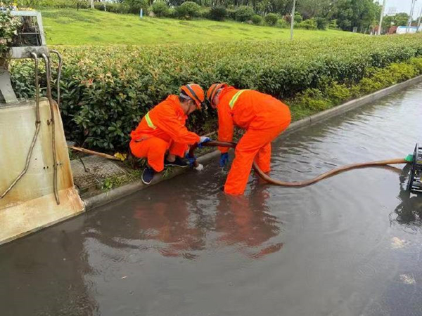 寧波市政設施中心立刻對現場進行應急處置,并對現場積水原因進行快速排查,隨后根據實際情況,使用抽水泵對路面積水進行快速處置,后利用疏通車高壓水槍對堵塞雨水管進行疏通。歷時近一小時完成了對路面積水情況的處置,確保了高架橋路面通行順暢。