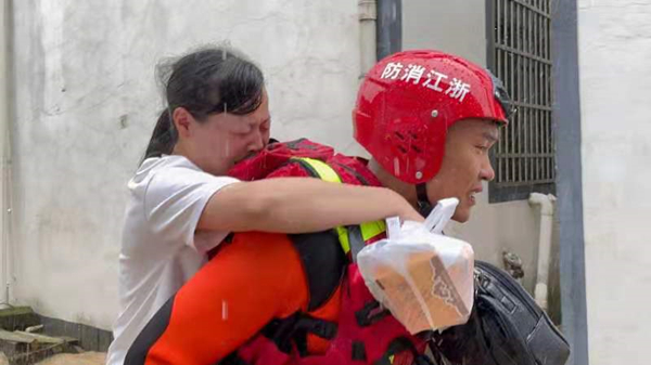 消防指戰員采取抱、背以及借助舟艇等方式緊急營救轉移被困人員。紹興市委宣傳部供圖