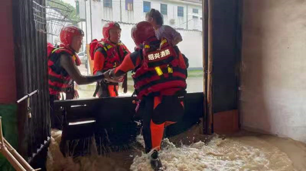 7月25日0時40分,寧波市區永豐路13號附近因姚江水位驟升,江水漫上道路倒灌家中,有人員被困,亟待救援。消防救援人員蹚過半米深的水,將8名被困人員一一帶離積水地帶。